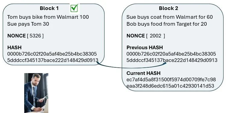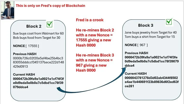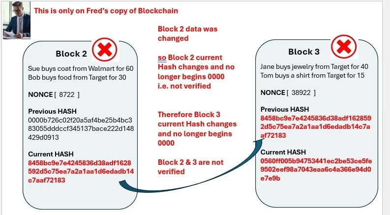 Here we see the old & new Block 2 on Fred’s copy of the Blockchain