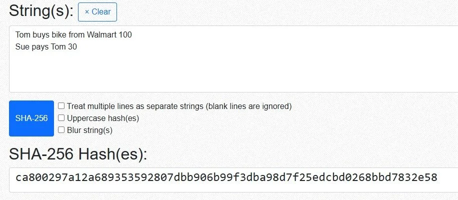 Now type the entire block 1 transaction data into the string to be Hashed: