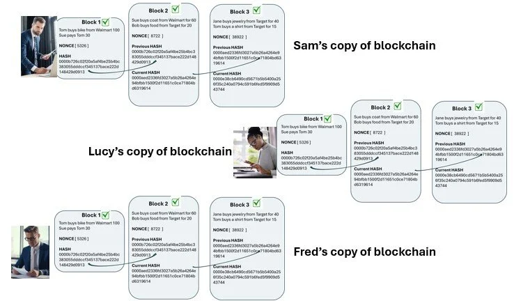 Lets look at all the copies of the Blockchain, Fred, Lucy & Sam